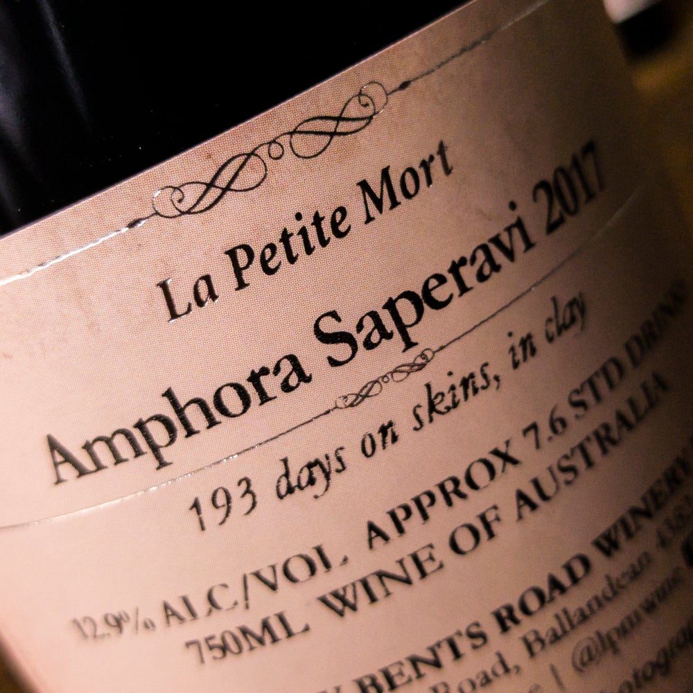 2022 La Petite Mort Amphora Saperavi is the ultimate expression of old-school winemaking. The Georgian republic in the Caucuses quite possibly has the longest continuous history of winemaking in the world.. and Saperavi is their noble grape. Its also one of about 5 grape varieties IN THE WORLD that have red juice as well as red skins!! Our Saperavi is produced as closely as possible to the old-ways with whole berries fermented in earthenware pots and then left in contact with its skins and seeds for a whopping 183 days!! (that's like 6 months). During this time, we basically don't touch it so the wine is produced with absolute minimal handling or additions. After pressing the wine to separate it from its skins, it is clarified by settling (no filtration) and bottled as-is with only a small SO2 addition to ensure stability. The wine in the glass is dense and intense with distinctly savoury, old-world charms and long, silky tannin structure.