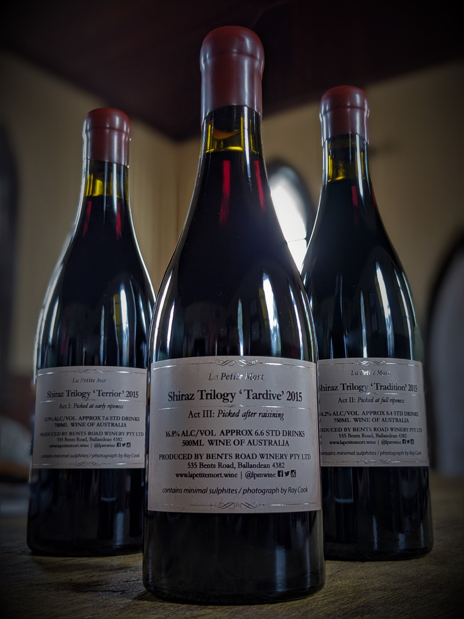 2015 La Petite Mort Shiraz 'Trilogy' is a trio of three wines made with TIME as the ultimate dictator of fate. These three wines were made to illustrate the consequence of picking times. Each wine was picked from the same vineyard, on three separate occasions, at three week intervals.